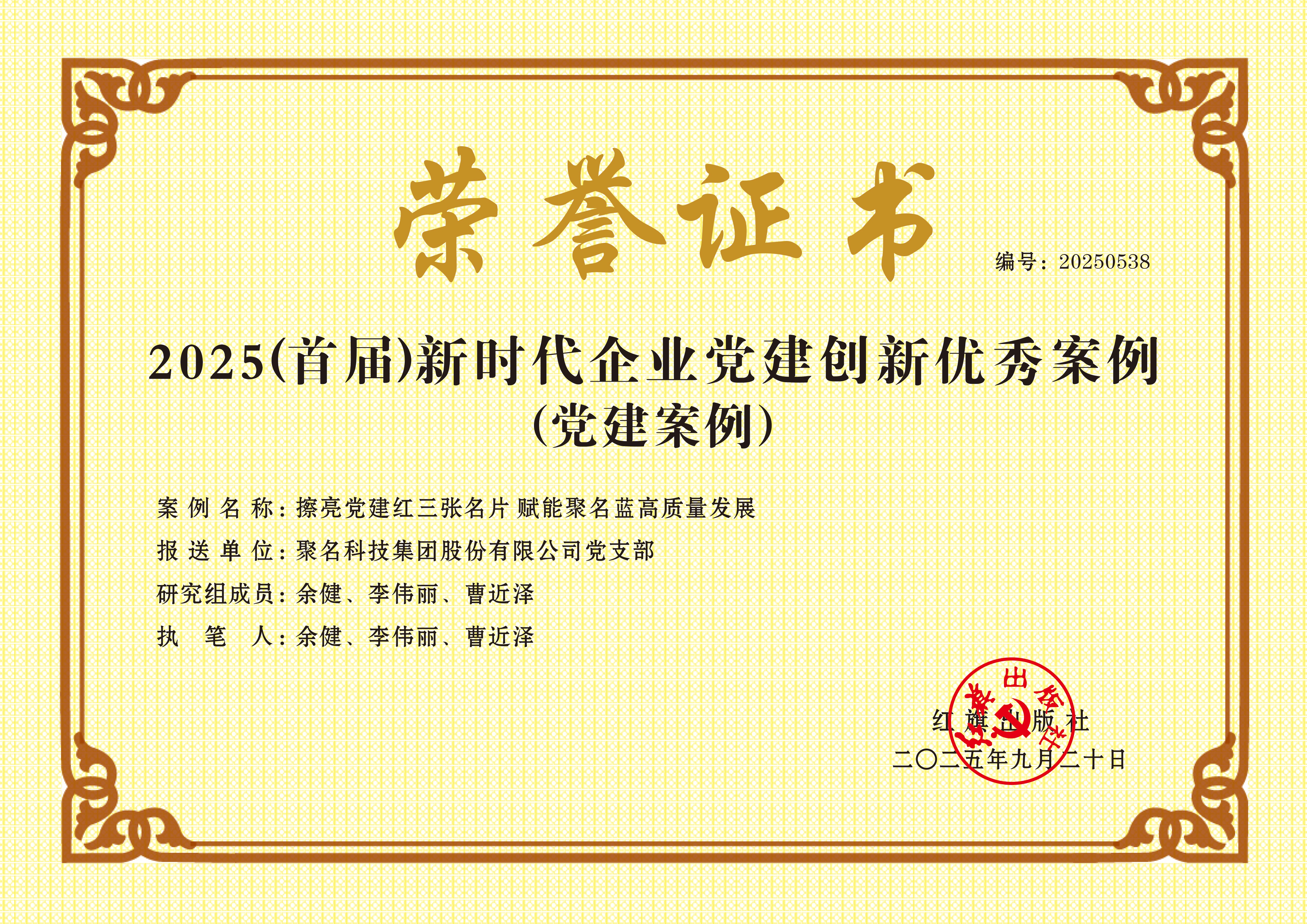 近日,2025(首届)新时代企业党建经验交流会暨企业党建创新优秀案例发布仪式在北京隆重召开,由聚名科技集团党支部申报的《擦亮党建红三张名片赋能聚名蓝高质量发展》案例,凭借其创新做法与显著成效,成功入选新时代企业党建创新优秀案例。